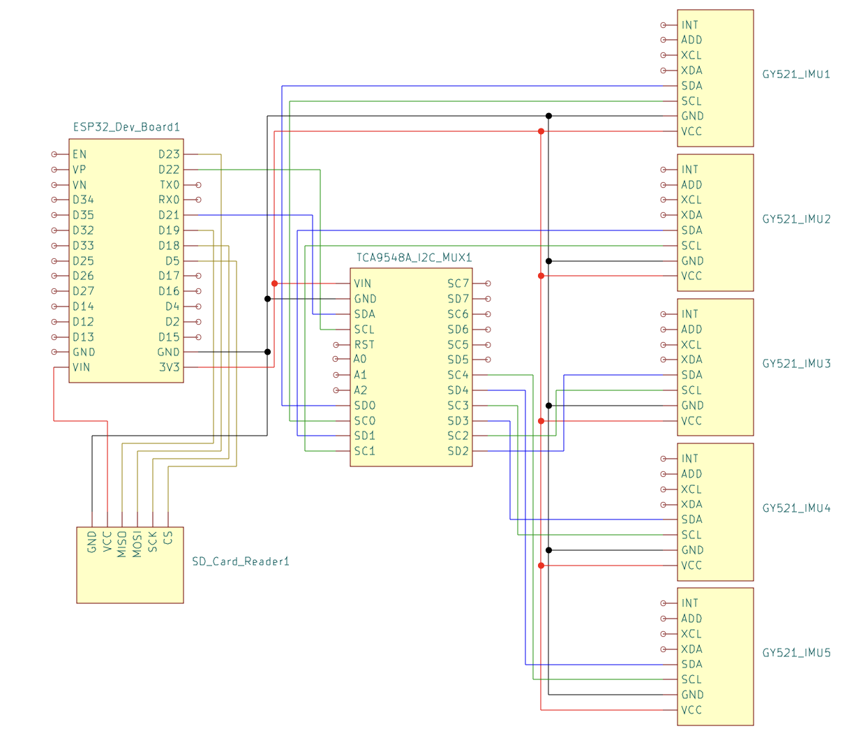 The ESP32 microcontroller is configured to interface with five GY-521 IMUs through an I2C multiplexer. Each IMU contains an MPU6050 sensor that measures three-dimensional linear acceleration and rotational velocity. The data collection is handled by one core of the ESP32, which collects all 6 measurements from all 5 sensors at a frequency of exactly 100 Hz. The measurements are read and stored as signed 16 bit integers. The readMPU6050, as seen in the code snippet, is responsible for the reading of the sensor